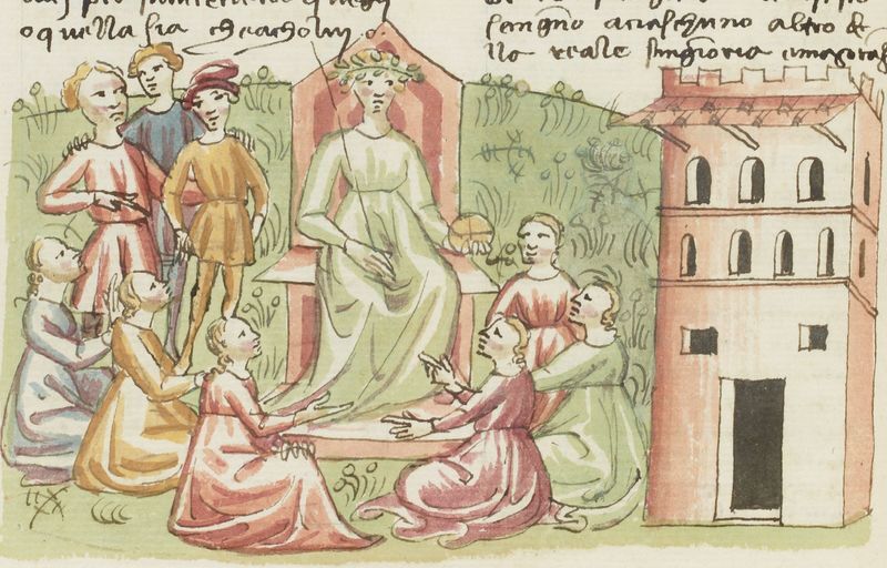 Si tratteranno qui per due settimane in tutto, dal mercoledì antecedente alla Domenica delle Palme a quello successivo alla Pasqua, e decidono di eleggere ogni giorno una regina o un re cui spetta il compito di amministrare le attività quotidiane del gruppo. Queste comprendono il passeggiare, il cantare, il conversare e ovviamente il novellare, in cui parlando uno solo alla volta «può porgere, dicendo uno, a tutta la compagnia che ascolta diletto» (Prima Giornata, Introduzione, BIBIT).