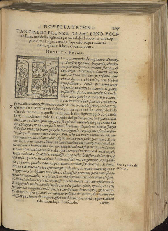 Nella stessa pagina è di interesse la postilla linguistica, con cui Salviati cerca di alterare la fisionomia di Ghismunda, eroina tragica, eloquente e di animo nobile. Il testo di Boccaccio recita «bellissima del corpo e del viso quanto alcuna altra femina fosse mai, e giovane e gagliarda e savia più che a donna per avventura non si richiedea» (ed. Salviati, p. 207). E l’editore postilla «Savia, qui vale accorta», privando il termine della sua connotazione morale positiva e insinuando la colpa della protagonista nella fine tragica che la attende.