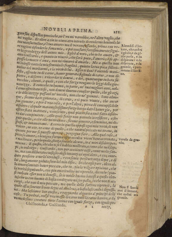 Infatti, in avvio della sequenza in cui Ghismunda sta per essere scoperta con il suo amante dal padre, una postilla specifica: «Chi fa quel ch’e’ non debbe, gl’interviene quel, che’e’ non crede» (ed. Salviati, p. 209). Il commento è affine ai «sensi morali» che dalla seconda metà del Cinquecento sono pubblicati da alcuni editori insieme ai libri di novelle per rivederne il significato ed evitarne la censura, come ad esempio succede alla riedizione milanese delle Novelle di Matteo Bandello del 1560 curata da Ascanio Centorio Degli Ortensi.