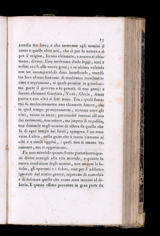 [Giove] mandò tra loro alcuni fantasmi di sembianze eccellentissime e soprumane, ai quali permise in grandissima parte il governo e la potestà di esse genti: e furono chiamati Giustizia, Virtù, Gloria, Amor patrio e con altri sì fatti nomi.