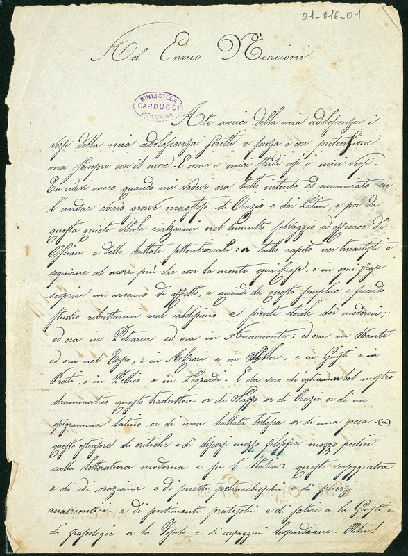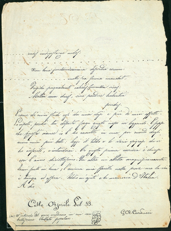 Carducci inizia a scrivere poesie con notevole precocità (cfr. Tognarelli 2017, pp. 55-56). Il più antico componimento ad esserci giunto è il sonetto A Dio, composto a soli tredici anni nel maggio 1848 (ACC, Manoscritti, Poesie, 1.1; OEN I, p. 331); anche se – ed è il poeta stesso a ricordarlo – già nel 1846 aveva scrive «un’ottava burlesca in morte d’una civetta e certe terzine satiriche contro Maria Antonietta Gran Duchessa» (ACC, Manoscritti, Poesie, 1.9.01v), di cui oggi non rimane traccia nell’Archivio.