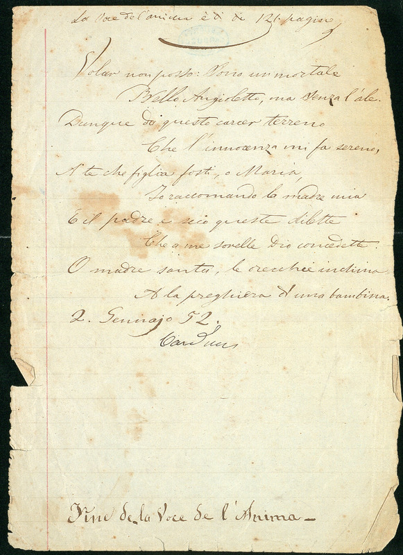 In ACC, Manoscritti, Poesie, 1.54 si conserva l’autografo dell’idillio La preghiera di una fanciulla, datato 2 gennaio 1852, che – come attestano alcuni appunti autografi vergati da Carducci sul verso della carta – avrebbe dovuto terminare una raccolta di 121 pagine intitolata Voce de l'Anima.