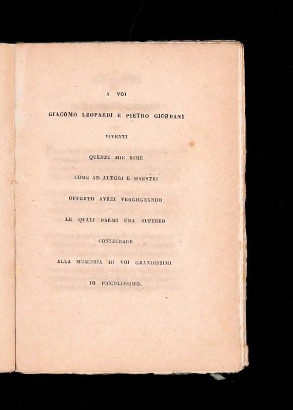 La pagina a fronte di quella recante l’epigrafe properziana ospita il secondo dei segnali paratestuali della raccolta, vale a dire la dedica a Giacomo Leopardi e a Pietro Giordani.