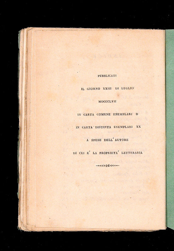 È anzitutto opportuno partire da quei «segnali accessori» (Genette 1997, p. 5) che ne accompagnano la ricezione e ne orientano l’interpretazione, completandone e, al contempo, illuminandone più chiaramente il significato. Nel caso dell’edizione delle Rime del 1857, tali elementi paratestuali (che, appunto, si depositano attorno al testo) costituiscono un sistema di soglie atto a mediare il rapporto tra opera e lettore. Il loro esame consente infatti di ricostruire il progetto autoriale, chiarendo presupposti ideologici, scelte formali e strategie di autorappresentazione.