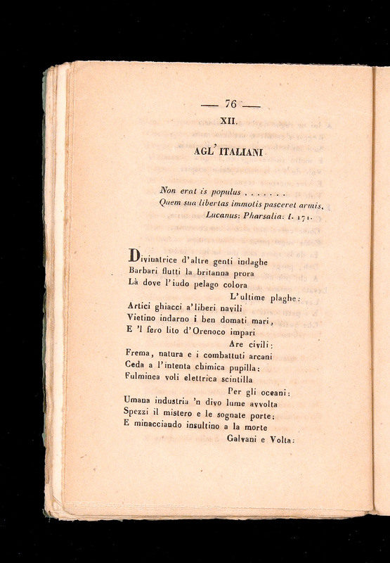 Agl’italiani, dodicesimo canto della raccolta, rilancia esplicitamente la funzione civile della poesia, trasformando il verso in denuncia e appello morale. Carducci si rivolge infatti alla nazione, contrapponendo grandi progressi scientifici e tecnici dell’età moderna alla decadenza morale della società italiana (vv. 1-20). Le conquiste del sapere non bastano se non sono accompagnate dalla virtù (vv. 17-18):